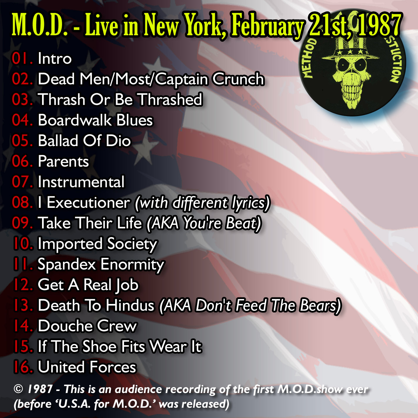 This was the first show M.O.D. ever did, 'U.S.A. for M.O.D.' wasn't even released yet. Some tracks have different titles and/or lyrics than the ones that appeared on the record.